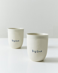Her parça elde üretilir ve her birinin pürüzsüz beyaz taş yüzeyi ve mavi suluboya efekti ile yazılmış “Dog Mom” yazısı vardır.